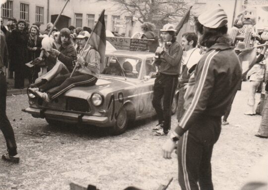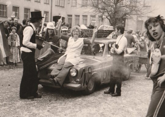 Erste Zugteilnahme 1976 mit einer Fußgruppe die sich hauptsächlich aus Jugendfußballern zusammensetzte. Bild: Wagenbauer SV04
