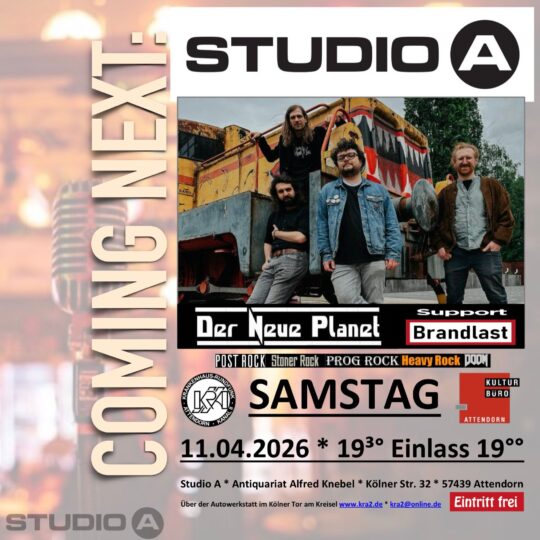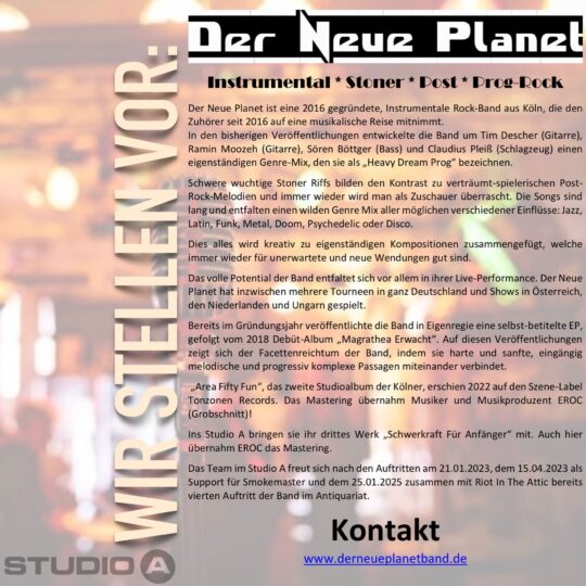 Am Samstag dem 11.04.2026 besucht uns erneut DER NEUE PLANET aus Köln! Als Support dabei ist die Ingolstädter Formation BRANDLAST! Beginn ist ACHTUNG schon um 19.30 Uhr, Einlas ab 19.00 Uhr. Anmeldungen sind unter kra2@online.de erwünscht! Wenn voll, dann voll. Bild: Privat