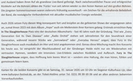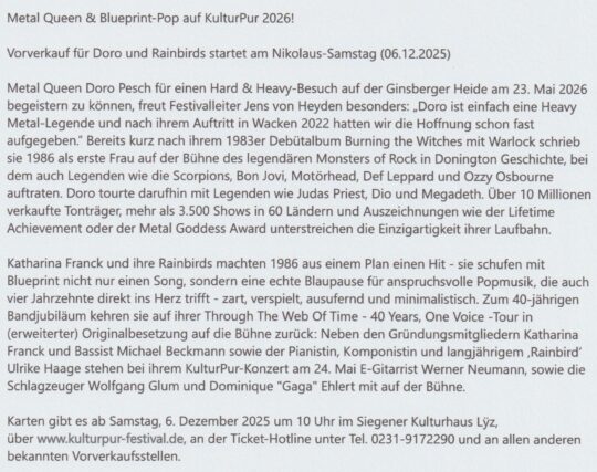 Der Vorverkauf für das 34. KulturPur Festival hat schon im Dezember 2025 begonnen. Die ersten Konzerte stehen schon mit der Metal Queen DORO PESCH den RAINBIRDS, FURY IN THE SLAUGHTERHOUSE und ENNIO fest. Unser Team wird weiter über das einzigartige Festival berichten. Den ein oder anderen Musiker haben wir schon am Mikrofon gehabt. Mehr unter …weiterlesen.