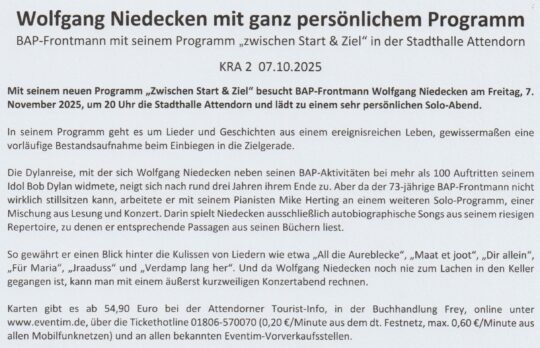 Am Freitag dem 07. November 2025 besucht nach langer Zeit, und diesmal mit seinem Soloprogramm, der Frontman der Deutschrocker BAPWolfgang Niedecken die Hansestadt Attendorn.